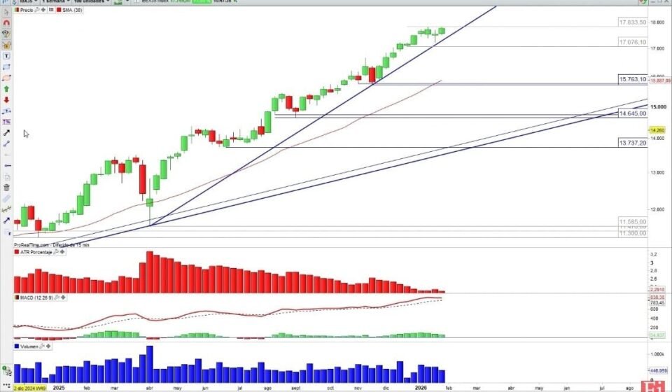 El IBEX 35 se encuentra en una fase de consolidación, buscando superar los máximos alcanzados a mediados de enero, que se sitúan en 17.833,50 puntos. Este nivel se ha convertido en un objetivo crucial para los inversores, ya que su superación podría abrir la puerta a un nuevo ciclo alcista.