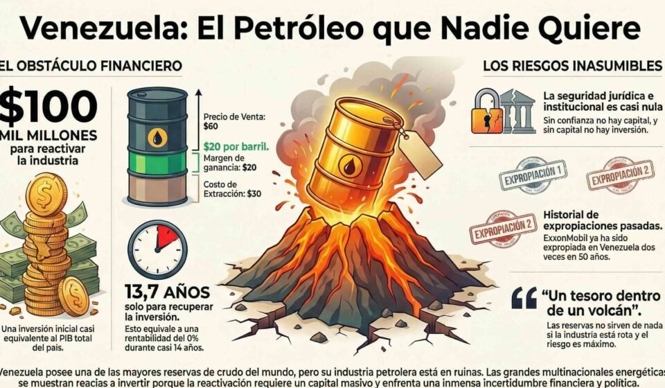 Para poner en marcha nuevamente la industria petrolera de Venezuela, se estima que se necesitaría una inversión de aproximadamente 100.000 millones de dólares. Esta cifra es casi equivalente al Producto Interno Bruto (PIB) del país. A pesar de la magnitud de la inversión, grandes empresas como ExxonMobil y Shell han mostrado reticencia a entrar en el mercado. La razón es simple: el riesgo financiero es demasiado alto.
